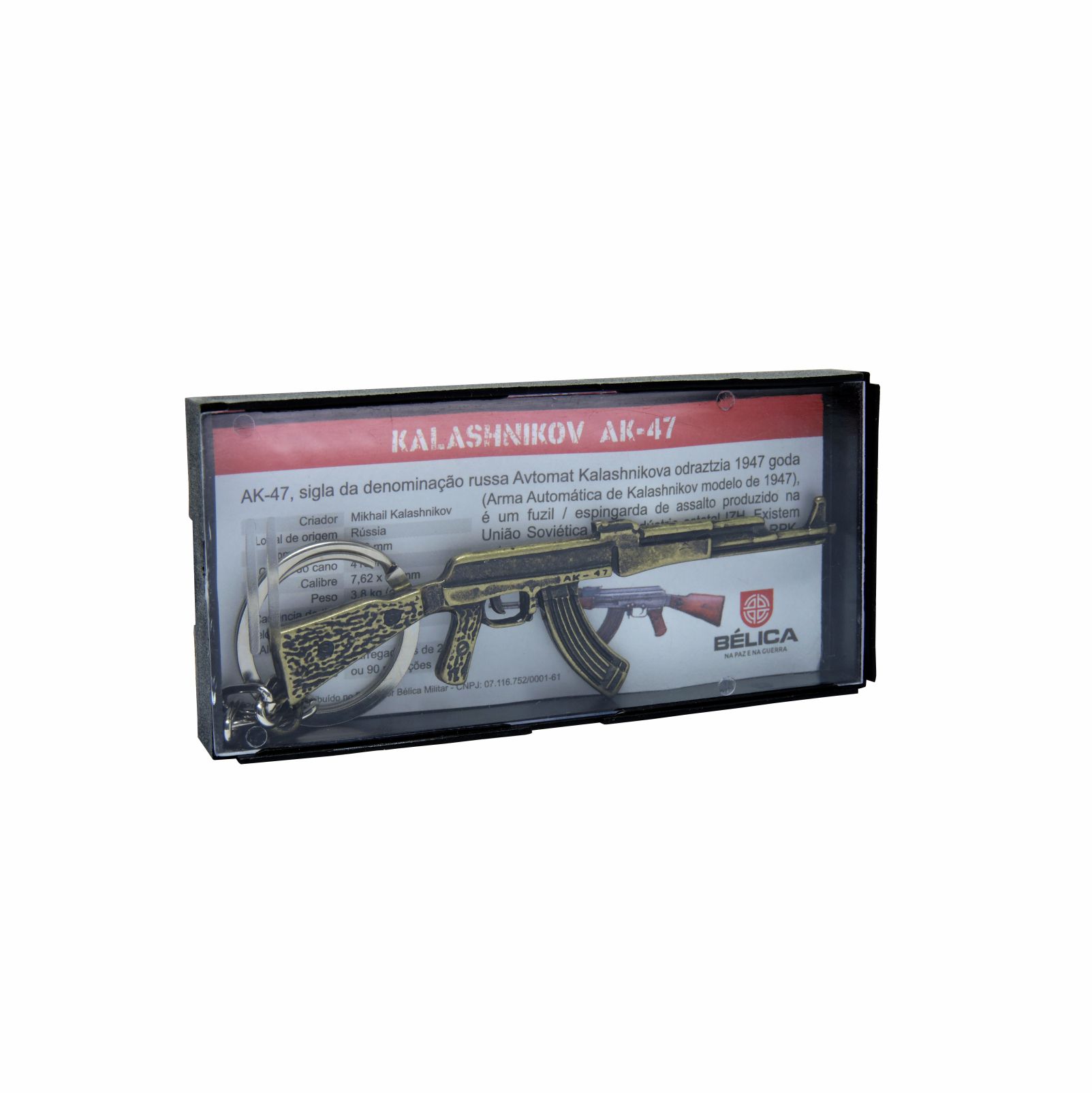 Chaveiro inspirado no modelo AK 47, sigla da denominação russa Avtomat Kalashnikova 1947, (Arma automática de Kalashnikova modelo de 1947), é um fuzil / Espingarda de assalto Produzido na União Soviética pela indústria estatal IZH.