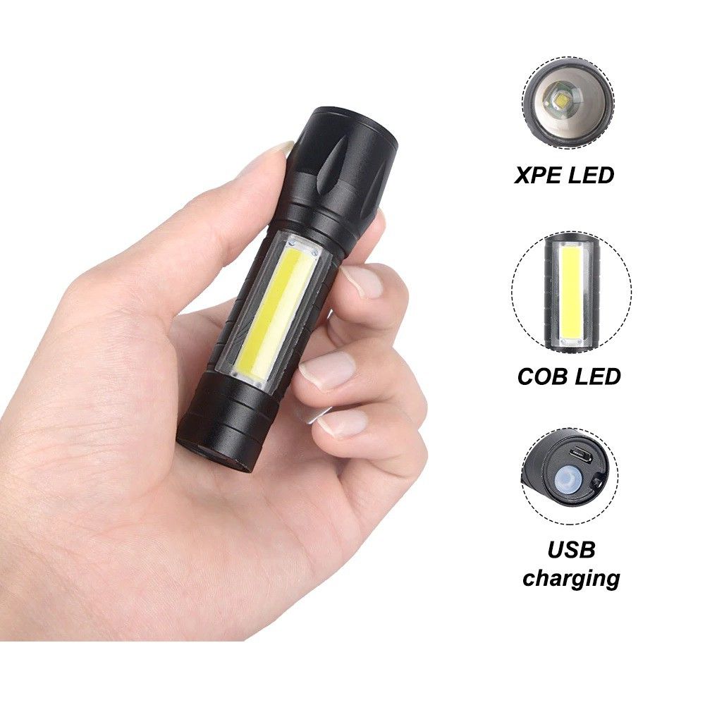-3 modos de luz LED: pressione o botão On/Off interruptor de gatilho com XPE luz alta, XPE strobo, COB luz alta.